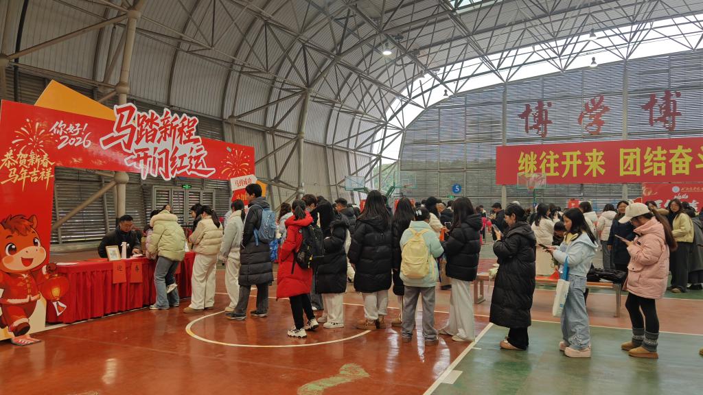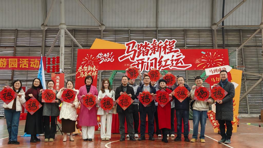 2025年12月30日下午,学校迎新春师生游园联欢活动在蜂巢体育馆举行。为办好负责站点的项目,马克思主义学院邀请新都区⾹城⼯匠、成都⽊版⽔印技艺第四代传承⼈曾凯老师助阵,为师生现场拓印非遗木版生肖福字,同时活动现场还设置了“欢乐套圈圈”小游戏。近四小时的活动时间里,马院活动站点人头攒动,两个项目吸引近千名师生光临。