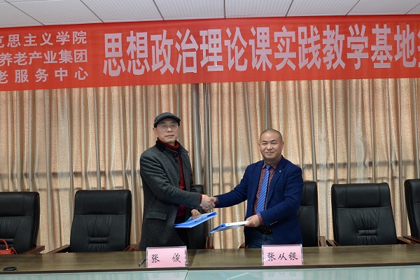 马院院长张俊与双方负责人签订了《思想政治理论课实践教学基地共建协议》。签字仪式后,双方进行了座谈交流,与会人员围绕健康养老、实践教学基地共建等问题进行了深入交流。