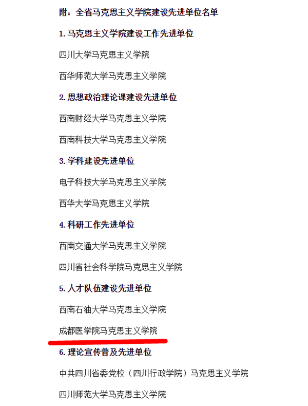 本次评选四川省马克思主义学院建设先进单位,共评出综合先进单位两个,由四川大学马克思主义学院和西华师范大学马克思主义学院获得;评出思想政治理论课建设先进单位、学科建设先进单位、科研工作先进单位、人才队伍建设先进单位、理论研究先进单位等五个单项奖,每个奖项分别评出2个先进单位,成都医学院荣膺人才队伍建设先进单位荣誉称号。