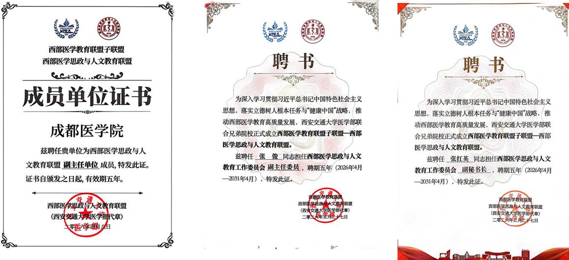 西部医学思政与人文教育联盟由西安交通大学、兰州大学、西藏大学、新疆医科大学、贵州医科大学、广西医科大学、昆明医科大学、重庆医科大学等35所西部院校组成。我校马克思主义学院张俊教授、张红英副教授分别受聘为西部医学思政与人文教育工作委员会副主任委员、副秘书长。